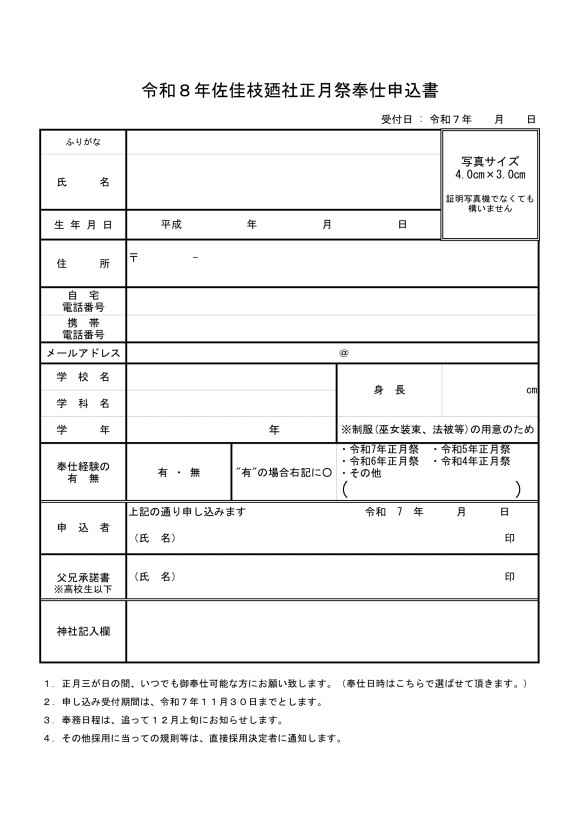 - 申込用紙は社務所に用意してございます。(ホームページよりプリントアウト可能)